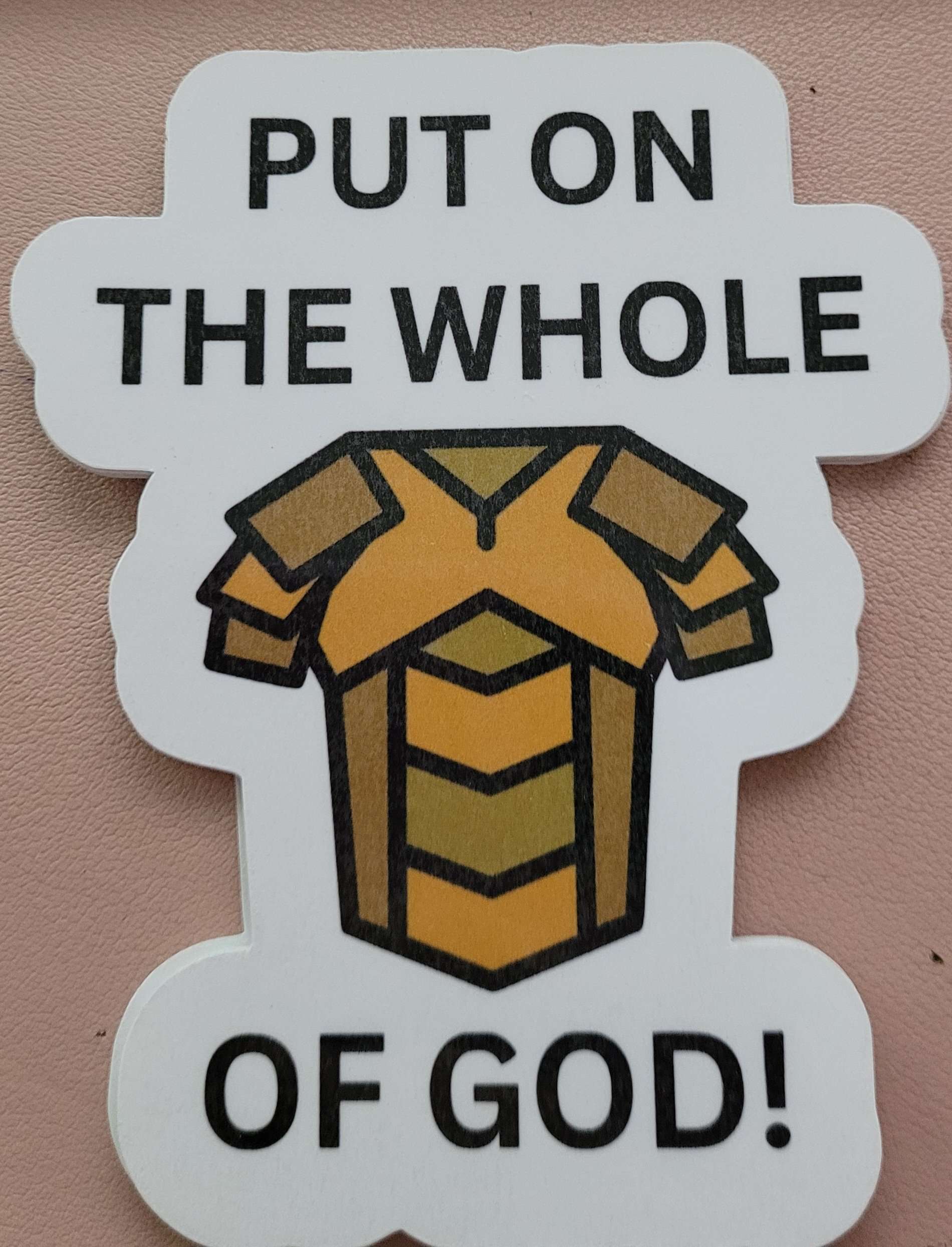 Imagine a vibrant laminated sticker featuring the phrase “Put on the Whole Armor of God” in bold, eye-catching typography. The text is set against a White background that combines elements of a shield and armor, symbolizing protection and strength. The design incorporates imagery of an armor shield. The laminate gives the sticker a glossy finish, enhancing its durability and making it perfect for sticking on notebooks, water bottles, or any surface that needs a reminder of faith and resilience. This sticker not only serves as an uplifting message but also as a beautiful piece of art!